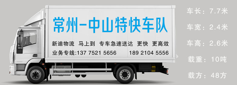 | 常州到中山貨車:7.7米長×2.4米寬×2.6米高 | 常州到中山7.7米貨車載重:10T /方數(shù):≈48方 | 常州到中山專車運輸業(yè)務(wù):13775215656 |